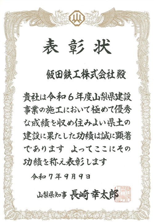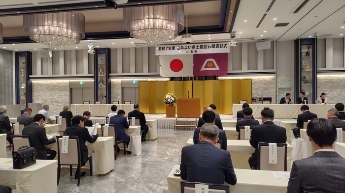 山梨県建設事業の施工において優秀な成績を収めた2件の工事及び、1名の技術者が表彰されました。